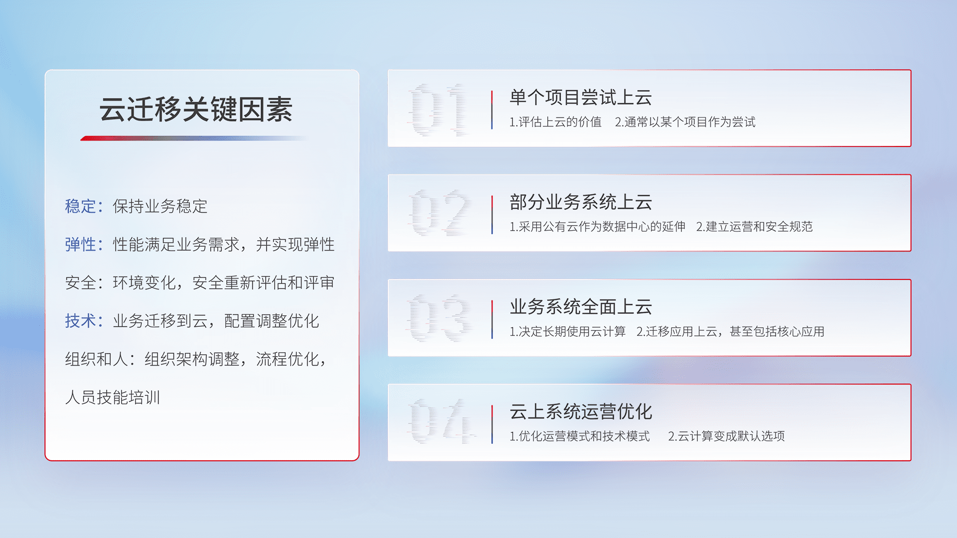 结合实际业务,,,,从规划设计、、、、云平台选型、、、、云原生改造、、、数据迁移、、、集成交付,,,迁移全过程为客户识别最佳上云路径,,做好风险识别管理,,,,设计网络架构、、、身份权限、、、、安全审计合规、、、、操作审计、、日志审计、、、、监控告警策略、、、、多站点容灾设计等,,,,对云上基础设施进行整体规划,,,提升IT治理水平,,,,以满足弹性、、高可用、、高性能的需求。。。。