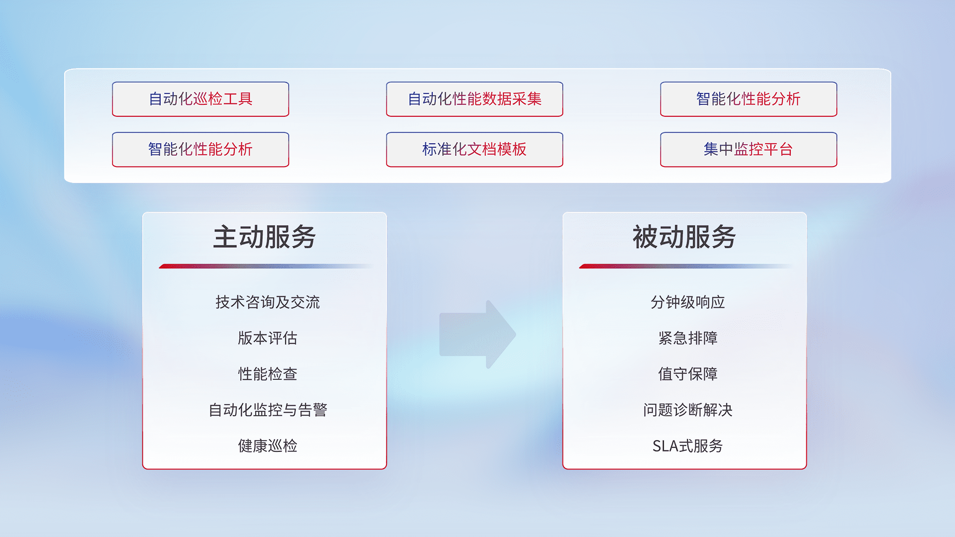 智能化工具和标准化文档,,,,保障服务质量,,,,提供主动服务(包含技术咨询、、版本评估、、性能检查、、、、自动化监控与告警、、、健康巡检)和被动服务包含(分钟级响应、、、、紧急排障、、、值守保障、、、问题诊断解决、、、、SLA服务)。。。
